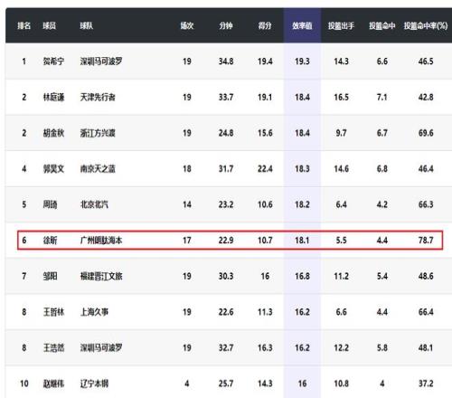 徐昕的效率值达到了18.1,在国内本土球员中排名第六,在他前面的是贺希宁、胡金秋、林庭谦、郭昊文和周琦。徐昕的投篮命中率在本赛季场均得到4分以上的球员中排名第一。徐昕场均得到7.3个篮板,在本赛季本土球员中排名第二,仅次于场均得到9.1个篮板的周琦。