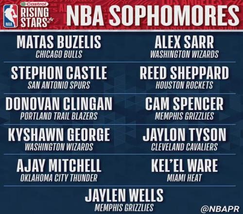 入选NBA全明星新秀赛的一年级球员,总共有10人,分别是弗拉格(独行侠)、克尼佩尔(黄蜂)、埃奇库姆(76人)、科沃德(灰熊)、奎因(鹈鹕)、特雷-约翰逊(奇才)、哈珀(马刺)、博伊尔斯(猛龙)、杰明(篮网)和费尔斯(鹈鹕)。