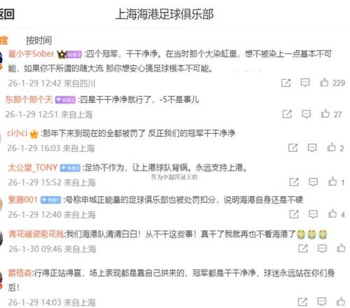 这些海港球迷到底说了啥?其中点赞最多的一个留言写道:四个冠军,干干净净,如果你无所谓的随大流 那你想安心搞足球根本不可能(下图)。除了这个留言,不少留言都表达了类似的观点,认为海港队清清白白,四星干干净净。还有人认为,只要四星干干净净就行,扣5分不是事。更有人批足协不作为,让海港背g。