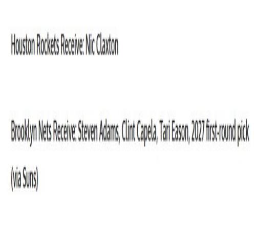 篮网得到:亚当斯+卡佩拉+伊森+27年太阳首轮签。